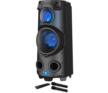 BT 5.0,FM,mikrofonní vstup: 2 x,bezdrátový mikrofon: 2 ks,AUX-IN,USB slot,SD/TF/MMC/Micro-S -Micro SD karta,12" basový reproduktor, 5” basový reproduktor, 2,5" výškové reproduktory, 1,5” výškové reproduktory,audio formáty:MP3,frekvenční odezva:20 Hz-20 kHz,impedance: 3,6 ohmů,LED světla,300W RMS