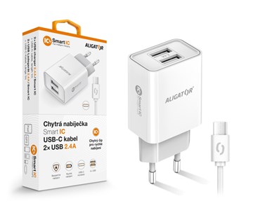 Chytrá síťová nabíječka ALIGATOR 2,4A, 2xUSB, smart IC, bílá, USB-C kabel - Vybavena chytrým čipem pro rychlé nabíjení. Až 5x rychlejší nabíjení proti běžné nabíječce. Technické údaje: • Vstup: AC 100-240V• Výstup: DC 2x5V 2.4A •adaptivní nabíjení • Ochrana proti zkratu•Micro USB kabel 2A