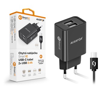 Chytrá síťová nabíječka ALIGATOR 2,4A, 2xUSB, smart IC, černá, USB-C kabel - Vybavena chytrým čipem pro rychlé nabíjení. Až 5x rychlejší nabíjení proti běžné nabíječce. Technické údaje: • Vstup: AC 100-240V• Výstup: DC 2x5V 2.4A •adaptivní nabíjení • Ochrana proti zkratu• USB C kabel 2A