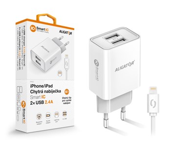 Chytrá síťová nabíječka ALIGATOR 2.4A, 2xUSB, smart IC, bílá, kabel pro iPhone/iPad 2A. Tato nabíječka je ideální pomocníkem pro dobíjení mobilního telefonu a jiných zařízení. Chytrá nabíječka zvládne doplnit energii až dvěma přístrojům najednou, navíc je vybavena chytrým čipem pro rychlé nabíjení.