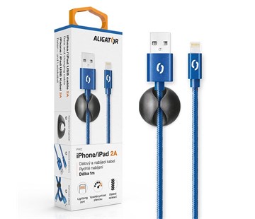 Datový kabel ALIGATOR PREMIUM 2A, Lightning modrý - ALIGATOR PREMIUM jsou špičkové USB kabely v nejvyšší kvalitě s možností rychlého nabíjení 2A.Součástí balení je nalepovací organizér s jehož pomocí můžete uspořádat své USB kabely.