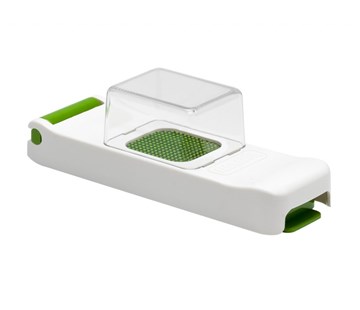 Používání ručního kráječe potravin Alligator Mini je velmi snadné. Bílou část stačí nadzvednout, vložit zeleninu, kráječ přiklopit a následně zatlačit směrem dolů. Během okamžiku získáte drobné tyčinky či kostky o velikosti 3 mm, a to vše jen s minimální námahou. Součástí vybavení je i praktický sběrný zásobník. Otočením kráječe přemístíte zeleninu do zásobníku a z toho pak následně do připravovaných pokrmů. |