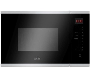 vestavná mikrovlnná trouba • objem 25 l • mikrovlnný výkon 900 W • výkon grilu 1000 W • 5 úrovní ohřevu • 8 programů • otočný talíř o průměru 31,5 cm • vnitřní nerezový povrch • senzorové otevírání dvířek • dětská pojistka • automatické programy • LED displej • dotykové ovládání • zvukový signál při ukončení procesu • 38,2×59,4×40,3 cm