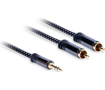 Audio kabel 3,5mm Jack (M) – 2xRCA (M) stereo, vodič z čisté bezkyslíkaté mědi OFC 99,96 %, perfektní přenos signálu, zlacené kontakty 24K, dokonalý kontakt a dlouhá životnost, kvalitní stínění zamezí rušení signálu, stíněné kovové konektory, venkovní oplet chránící kabel, délka 0,75 m.