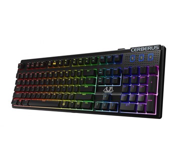 Mechanická herní klávesnice Cerberus Mech RGB s podsvícenými RGB efekty.