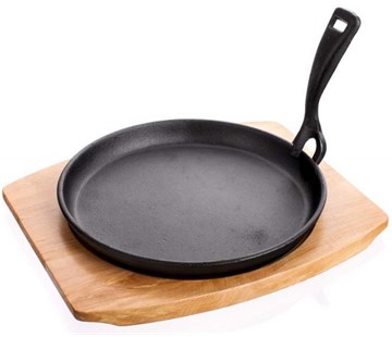 Pánev litinová na dřevěném prkénku GRADA 22 cmKulatá litinová pánev 22 cm na dřevěném prkénku, odnímatelné litinové držadlo na vyndávání pánve z trouby. Pánev je vhodná pro zapékání pokrmů, lze jí použít pro přímé servírování, dřevěné prkénko slouží jako podložka pod horkou pánev. Pánev lze použít p