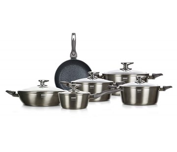 V sadě nádobí Banquet Metallic Platinum najdete menší rendlík o průměru 16 cm, dále pak hrnce o průměru 20, 24, 26 a 28 cm a samozřejmostí je také pánev o průměru 26 cm. Hrnce i rendlík jsou navíc opatřeny praktickou pokličkou s nerezovým držadlem. Po vaření tak nemusíte nutně umývat celý sporák. Skrz skleněnou pokličku navíc snadno zkontrolujete připravované pokrmy. Veškeré nádobí je vybaveno držadly se Soft Touch povrchem. Nemusíte se tedy obávat, že vám hrnec nebo pánev nedopatřením vyklouzne z ruky |