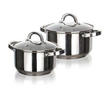 Sada nerezového nádobí SWING Big, 4 ksSada nerezového nádobí SWING 4 ks obsahuje: hrnec 18 x 11cm s poklicí, hrnec 22 x 13 cm s poklicí. Nádobí lze používat na všechny typy sporáků. Poklice jsou vyrobeny z odolného skla a mají otvor na páru pro dokonalou kontrolu nad vařením. Povrchová úprava nerezu lesk (uvnitř i vně). Nádobí se snadno udržuje, lze mýt v myčce. Držadla jsou k hrncům našroubovaná.