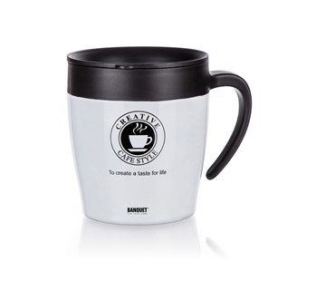 Termohrnek TAZZA 330ml bílý; Dvoustěnný cestovní termohrnek TAZZA v bílé barvě, je vhodný na teplé i studené nápoje. Vnější část je vyrobena z nerezi 201, vnitřní část z nerezi 304 a víčko z plastu. Využitelný objem je 330 ml. Tělo hrnku je vakuové, udrží nápoje déle horké či studené, víčko je nepropustné.