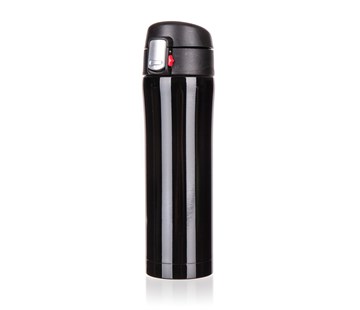 Termoska BODO 430 ml černý; Cestovní termoska BODO o objemu 430 ml má vnější i vnitřní povrch z nerezi a plastové vyklápěcí víčko. Díky dvoustěnnému provedení si udrží nápoj déle svou teplotu. Víčko se otevírá stisknutím pojistky, u které je zámek zabraňující nechtěnému otevření termosky.