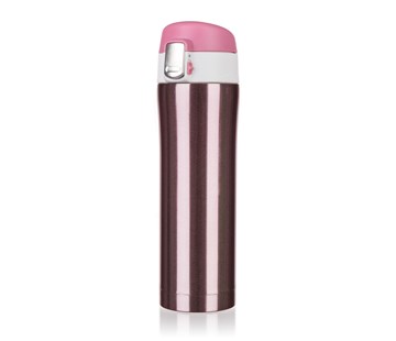 Termoska BODO 430ml růž.met.; Cestovní termoska BODO o objemu 430 ml má vnější i vnitřní povrch z nerezi a plastové vyklápěcí víčko. Díky dvoustěnnému provedení si udrží nápoj déle svou teplotu. Víčko se otevírá stisknutím pojistky, u které je zámek zabraňující nechtěnému otevření termosky.
