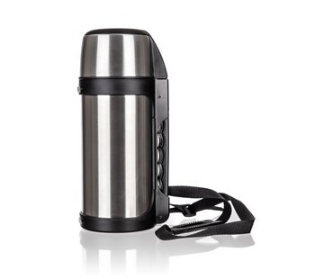 Termoska cest. PENTA 1,5l ner.; Nerezová cestovní termoska PENTA o objemu 1,5 l, má dvouplášťové provedení, vnější i vnitřní povrch je vyroben z nerezi 201. Má plastový uzávěr a ve víčku termosky je vložen pohárek na pití. Součástí termosky je plastové držadlo a popruh pro pohodlné nošení. Nerezové termosky jsou velmi odolné a bezpečné, nehrozí rozbití vložky či opaření při manipulaci. Teplotní pokles je závislý na teplotě nápoje při plnění, množství nápoje a teplotě okolí.