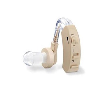 naslouchátko pro lidi s omezeným sluchem, ergonomický tvar, tři velikosti vyměnitelných silikonových krytek, tělová barva, maximální zesílení o 40 dB, maximální hlasitost 128 dB, pouzdro