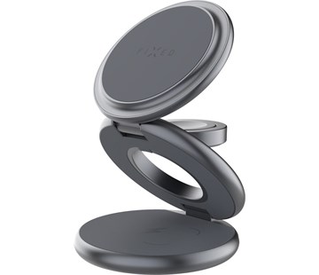 Kompaktní bezdrátová nabíječka FIXED MagPowerstation Round s podporou MagSafe je ideální volbou pro nabíjení až tří zařízení současně. Hlavní nabíjecí plocha s MagSafe magnety pevně přichytí iPhone řady 12 a vyšší, ať už ve vertikální, nebo horizontální poloze, a okamžitě zahájí bezdrátové nabíjení s výkonem 7,5W. Zvýšená plocha je navíc přesně přizpůsobena tak, aby nezasahovala do fotoaparátu telefonu a zajistila jeho bezpečné přichycení a nabíjení. Telefony ostatních značek nabijete s výkonem až 15W. Druhá plocha slouží pro dobíjení bezdrátových sluchátek a integrovaná vyklápěcí plocha je určena pro hodinky Apple Watch. Tělo nabíječky je vyrobeno z odolné kovové slitiny se silikonovými prvky, které chrání nabíjená zařízení před poškrábáním. Díky nastavitelným kloubům lze upravit ideální úhel stojánku, který pevně drží ve zvolené pozici. Ve složeném stavu má kompaktní velikost ideální na cesty, s možností stále využívat horní plochu jako nabíjecí podložku. Nabíječka disponuje vstupním USB-C konektorem a pro plný výkon vyžaduje napájení o výkonu minimálně 25W ve standardu PD.
