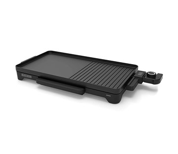 elektrický gril • výkon 2200 W • extra velká varná plocha (49 × 27 / 0,18 cm) • litinová grilovací deska • vestavěné topné těleso • odnímatelný termostat s ovladačem pro nastavení teploty • nepřilnavý PTFE povlak • ergonomické rukojeti (chladné na dotek) • odnímatelný tácek na sběr tuku (s možností mytí v myčce)