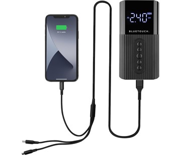 |  | Potřebujete dofouknout kolo, koloběžku nebo míč? S Bluetouch kompresorem s powerbankou to bude hračka a navíc s sebou budete mít vždy zásobu energie pro váš mobilní telefon nebo další drobnou elektroniku. Součástí balení je široká sada nástavců pro nafouknutí míče, pneumatiky motorky či auta, kola, elektrokoloběžky, nebo nafukovacího bazénku a matrace. Vedle kompresoru a powerbanky se v těle přístroje nachází LED osvětlení. |