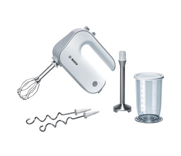 Samozřejmostí jsou 2 stabilní hnětací háky a 2 vysoce výkonné šlehací metly z ušlechtilé oceli se speciálními kuličkami FineCreamer, které zaručují dokonalý výsledek při šlehání v krátkém čase. Ruční šlehač Bosch MFQ 4070 je rovněž vybaven robustní nerezovou mixovací nohou s inovovanou čtyřbřitou čepelí a mixovací nádobou s měrkou a víkem.