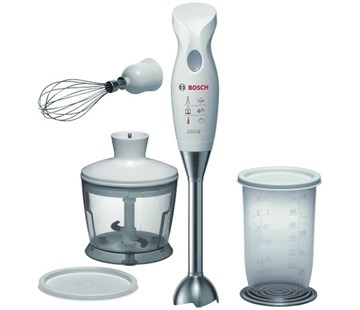 Ponorný mixér Bosch je dodáván s mixovací nádobou s měrnou stupnicí, praktickým univerzálním sekáčkem (na sekání např. cibule, masa, sýra, bylinek, oříšků…) a metlou na sníh z nerezové oceli. Další neodmyslitelnou součástí je vyjímatelná mixovací noha z tepelně odolného plastu omyvatelná v myčce a ochranný kryt ve tvaru zvonku, který zabraňuje odstříkávání a ulehčuje čištění.