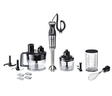Součástí balení je pestrá škála příslušenství. Určitě využijete nástavce na krájení, strouhání, sekání, hnětení i drcení. Nechybí ani ruční mini sekáček, který si poradí i s drcením kostek ledu. Součástí příslušenství je dále nerezová metla na sníh a velká mixovací nádoba s praktickou měrkou a víkem.