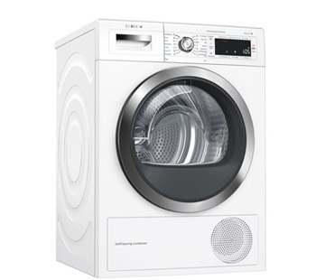 Kondenzační sušička s tepelným čerpadlem a samočisticím kondenzátorem a technologií Home Connect: praktické ovládání na dálku pomocí chytrého telefonu nebo tabletu.