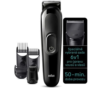 multifunkční zastřihovač • 6 v 1 • pro úpravu vousů a vlasů • Ni-MH baterie • 50 min. provozu • Obsah balení: zastřihovač, mini planžetový holicí strojek, vysouvací hřeben na vousy (3–11 mm), vysouvací hřeben na vlasy (13–21 mm), standardní hřeben s pevným střihem (1 mm), standardní hřeben s pevným střihem (2 mm), čisticí kartáček