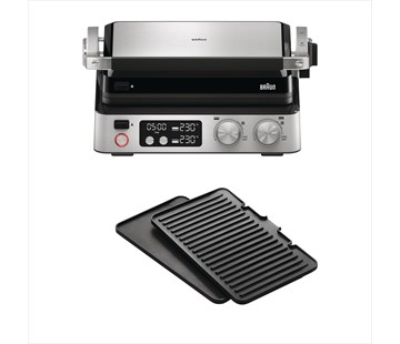 Kontaktní gril Braun CG7040 je vybaven dvěma nezávislými termostaty. Je tedy možné nastavit odlišnou teplotu pro horní a spodní grilovací desku, a to až do 230 °C. Vše potřebné nastavíte s pomocí otočných ovladačů a dotykových tlačítek. Na displeji můžete následně zkontrolovat zvolenou teplotu. Pokud hledáte novou inspiraci pro přípravu jídel, vyzkoušejte mobilní aplikaci Braun Cooking App, kde najdete mnoho zajímavých receptů. |