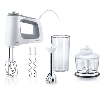 ruční šlehač • příkon 750 W • 9 rychlostních stupňů • vhodný pro šlehání, hnětení, mixování, sekání • TURBO tlačítko • technologie VarioControl • technologie SmartMix • systém EasyClick • systém ComfortClick • nástavce lze mýt v myčce nádobí • ergonomicky tvarovaná rukojeť SoftGrip • 1,55m přívodní kabel • příslušenství – 2 nerezové metly, 2 hnětací háky, mixovací nástavec a 600ml mixovací nádoba, sekací nástavec a 500ml nádoba