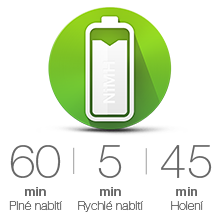 Výkonná NiMH baterie se plně dobije za 1 hodinu, strojek lze poté používat 45 minut bez použití napájecího kabelu. Rychlé 5-minutové nabití stačí na 1 oholení. Kontrolka LED vás upozorní když je váš holicí strojek třeba dobít.