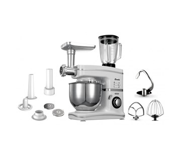 kuchyňský robot • příkon 1200 W • 3,5l pracovní mísa • vhodný pro šlehání, míchání, hnětení, mixování, mletí, krájení, krouhání, strouhání • planetární míchání • skleněný mixér • příslušenství - šlehací metla, hnětací háky, mlýnek na maso, mixovací nádoba