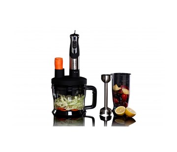 SOFT TOUCH rukojeť; 2 rychlosti provozu; objem nádoby 500 ml; sekací nůž, nerezová šlehací metla; 3 druhy struhadel - plátkování, nudličky a bramboráky; nádoba s víkem 1,5l; odnímatelný nerezový ponorný mixér pro snadné čištění; příkon 800 W