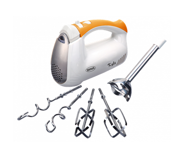 ruční šlehač • příkon 400 W • vhodný pro šlehání, hnětení, mixování • 5 rychlostních stupňů • funkce Turbo • příslušenství – nerezové šlehací metly, nerezové hnětací háky, nerezový ponorný mixér
