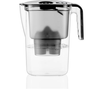 legantní černá filtrační konvice BWT VIDA o objemu 2.6 litru s mechanickým ukazatelem výměny filtru. Balení obsahuje jeden filtr, který obohacuje vodu o ionty zdraví prospěšný hořčík