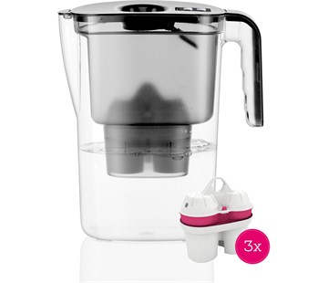 legantní černá filtrační konvice BWT VIDA o objemu 2.6 litru s mechanickým ukazatelem výměny filtru. Balení obsahuje 3x filtr, který obohacuje vodu o ionty zdraví prospěšný hořčík