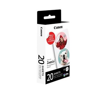 20 listů fotografického papíru ZINK Pre-Cut Circle o rozměru 76 × 50 mm, průměr kruhové nálepky 33 mm, 2 ks nálepek na listu, kompatibilita s Canon Zoemini mini, S2 a S