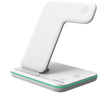 bezdrátová nabíjecí stanice podporující QI; nabíjí 3 zařízení současně; čipová sada Nuvoton; protiskluzová pogumovaná základna; dotykové tlačítko pro ovládání podsvícení; LED indikátor a podsvícení; 4 typy ochrany; kabel USB-C 1,2 m součástí balení; kompatibilní s Apple Watch / iPhone / Airpods