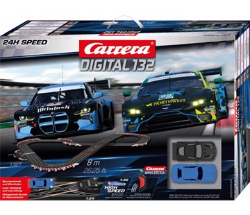 Autodráha Carrera Digital 132 dlouhá 8m s auty BMW M4 GT3 a Aston Martin Vantage GT3 obsahuje rovinky, zatáčky, bezdrátové ovladače, přemostění, díl na předjíždění zleva a zprava, napájecí díl a další díly.