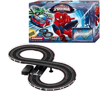 Autodráha Carrera GO!!! dlouhá 2,4m s auty z filmu Spiderman Spider a Goblin obsahuje rovinky, zatáčky, přemostění, napájecí díl na baterie a další díly. Autodráha je kompatibilní s auty a díly GO!!!. Do napájecího dílu je možné dát buď baterie nebo trafo