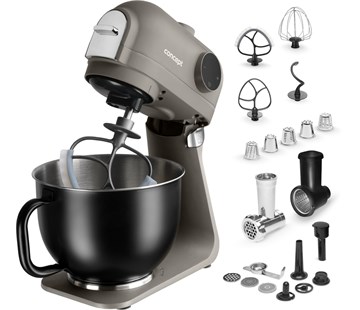kuchyňský robot • příkon 1200 W • 5l nerezová pracovní mísa • 7 stupňů rychlosti • vhodný pro šlehání, míchání, hnětení, mletí, krájení, strouhání • planetární systém míchání • systém Smart Stop Position • kovová základna a vnitřní převody • bezpečnostní pojistka • časovač • digitální dotykové ovládání • displej • příslušenství – šlehací metla, míchací metla, flexi metla, hnětací hák, mlýnek na maso, příslušenství pro plnění párků a klobás, nástavec na cukroví, struhadlo s 5 vyměnitelnými nástavci • tištěná minikuchařka • hmotnost 5,72 kg