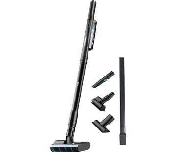 tyčový vysavač • BLDC motor • 14,8V Li-Ion baterie • 2 režimy vysávání • otočný kloub 360° • objem prachové nádoby 0,25 l • doba nabíjení 4–5 h • výdrž na jedno nabití až 30 min • hlučnost 78 dB • odnímatelný ruční vysavač • DualBrush kontrolka baterie • filtr HEPA 13 • vysoce účinná filtrace vhodná pro alergiky • příslušenství – nabíjecí stojan, hubice na čalounění, malý turbokartáč, držák na stěnu • hmotnost 1,77 kg