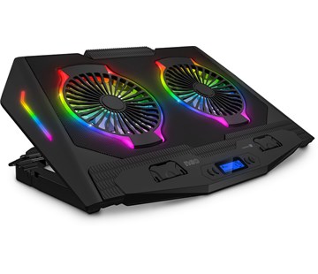 chladicí podložka pro notebook • kompatibilní se všemi notebooky do velikosti 17" • regulace rychlosti ventilátorů v 6 stupních • vyškově polohovatelná v 5 různých stupních (0°, 22°, 32°, 40° a 45°) • LCD display • 2× USB-A vstup pro napájení podložky a dalšího zařízení (např. mobilního telefonu nebo power banky) • 2 velké tiché ventilátory (125 mm) • RGB LED podsvícení se 7 módy • 1150 otáček za minutu • max. hlučnost: 21 dBA • rozměry (š×v×h): 46,1×29,4×5,2 cm • hmotnost 1,25 kg