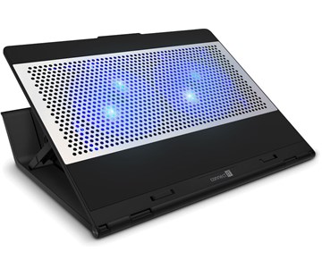 Chladicí podložka pod notebook s modrým podsvícením; Do velikosti 15,6"; Vyškově polohovatelná v 6 různých stupních; Hliníková chladící mřížka; 2 velké ventilátory (2x 12,5 cm); 1100 otáček za minutu; Napájení: Port USB-A (5V DC); Materiál: plast + hliník;