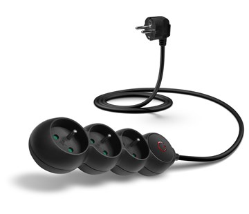 3 PowerRex2 1,5m BLACK, Prodlužovací přívod na 230 V,  s vypínačem všech zásuvek a dětskou ochranou, 3 zásuvky, Délka přívodního kabelu 1,5 m, Hlavní síťový vypínač ON/OFF, Max. proudové zatížení: 10 A, Vodič: H05VV-F 3G x 1.00 mm2, Zásuvky v úhlu 45°