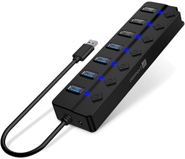 Další výhodou tohoto hubu je jeho jednoduchá instalace a použití. Stačí ho jednoduše připojit k volnému USB portu na počítači či notebooku a okamžitě můžete začít využívat další porty. Díky Plug & Play funkcionalitě není potřeba žádná složitá konfigurace nebo instalace ovladačů. Tento model disponuje LED indikátory zapnutí/vypnutí u každého portu. Využívat můžete také podporu připojení 2,5" disků. Zařízení je kompatibilní s operačními systémy Windows a Mac OS X. Délka přívodního kabelu činí 25 cm. |