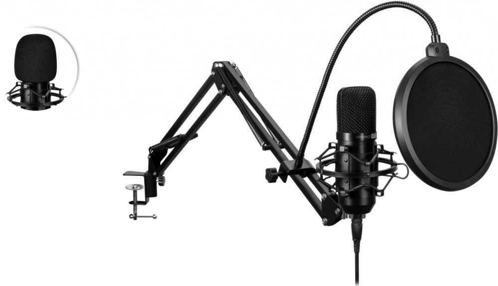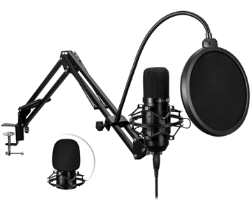 mikrofon • stolní rameno • POP filtr • vhodné pro záznam hlasu, zvuků a ruchů, hraní her, streamování, chatování (Messenger, Skype apod.), karaoke… • USB připojení • montáž na desku stolu o tloušťce až 4,5 cm • frekvenční rozsah 20 Hz – 16 kHz • délka kabelu 2,5 m • rozměry 152×47×44 mm • maximální délka ramene 700 mm