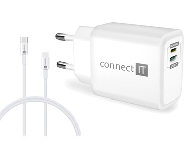cestovní nabíječka; 2x port - 1x Lightning, 1x USB-C; technologie Power Delivery (PD); rychlonabíjení 20 W; nabíjení Lightning vstupem / USB-C vstupem; univerzální 1 m kabel; dokáže přenést až 27 W; barva: bílá
