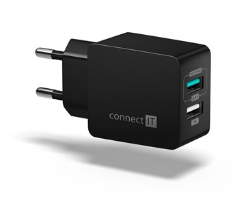 Cestovní USB nabíječka CONNECT IT "Fast Charge" určená pro napájení i nabíjení mobilních telefonů, tabletů, akčních kamer, elektronických čteček knih, MP3 přehrávačů, herních konzolí a mnoha dalších přenosných zařízení doma, v kanceláři i na cestách.