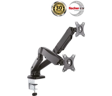 Univerzální držák na 2 monitory se zárukou 30 let. TV držák byl testován na trojnásobek uváděné nosnosti. Min. úhlopříčka monitoru: 13". Max. úhlopříčka monitoru: 27". Seznam podporovaných roztečí VESA: VESA 75×75, VESA 100×100