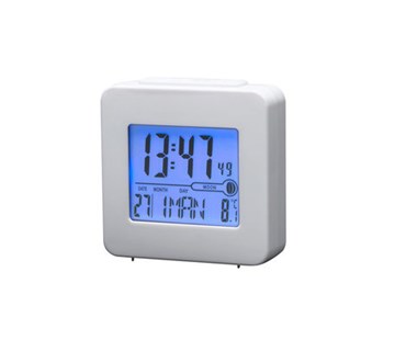 Digitální budík řízený rádiovým signálem s modrým podsvícením, funkce alarmu, zobrazení kalendáře, digitální teploměr, ukazuje fázi měsíce, funkce Time-zone (t+/-), funkce Snooze, napájení: 2x AAA baterie