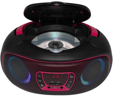 Boombox s Bluetooth, FM rádiem,CD/MP3 přehrávačem, USB vstupem, výkon 2 x 2W. LCD displej s LED osvětlení okolo reproduktorů (lze vypnout), napájení 230V, nebo baterie