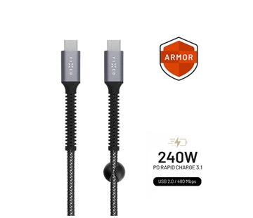 Prémiový kabel FIXED z řady ARMOR je vysoce odolný napájecí a datový kabel, který díky svým vlastnostem vydrží mnohonásobně déle než běžné kabely. Koncovky u konektorů bývají obvykle nejnamáhanějším místem kabelu a u většiny kabelů se brzy lámou. Kabel Armor má tuto část zpevněnou ochranným žebrováním, které je otestováno až na 150 tisíc ohybů, aby se zaručila dlouholetost používání. Odolnost kabelu je zvýšena kvalitním nylonovým opletením, které spolu s galvanizovanými koncovkami v barvě Space Gray ladí s řadou moderní elektroniky. Pro nabíjení poskytuje nadstandartní výkon až 240 W s podporou rychlonabíjení Power Delivery 3.1 a zároveň umožňuje přenos dat o rychlosti 480 Mb/s ve standardu USB 2.0. Na kabel se vztahuje garantovaná 5letá záruka. V balení najdete i praktický stahovací pásek pro snadný transport kabelu a nalepovací organizér, kterým zafixujete kabel na zvoleném místě.